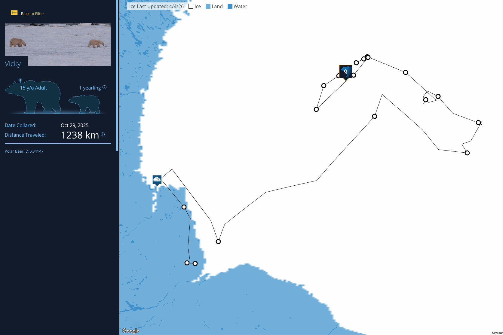 After being fairly close to the coast of Nunavut in late February, the family has since headed a bit north, then looped slightly south, seemingly headed back toward the Churchill area. But, they could veer off course at any time! Arctic Ambassador should be enjoying this spring season as she teaches her yearlings to hunt while there are plenty of seals to feast and fatten up on - we know they are in an area that’s good for seals. This whole family needs to gain as much weight as possible before summer comes, during which they will be forced to fast on land for months, surviving off of whatever fat they can put on now. We wish them a very happy and fat hunting season!