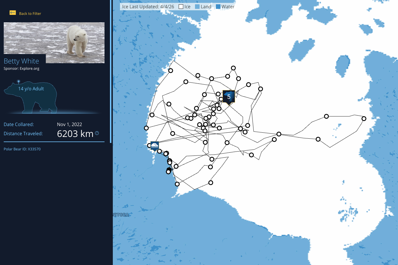 Fourteen-year-old Betty White will develop stinky feet to help males track and find her across the vast sea ice, which would otherwise be tough: as our biggest traveller on the Bear Tracker, Betty White has moved up, down, and all around Hudson Bay over the last few years, racking up over 6,000 km!