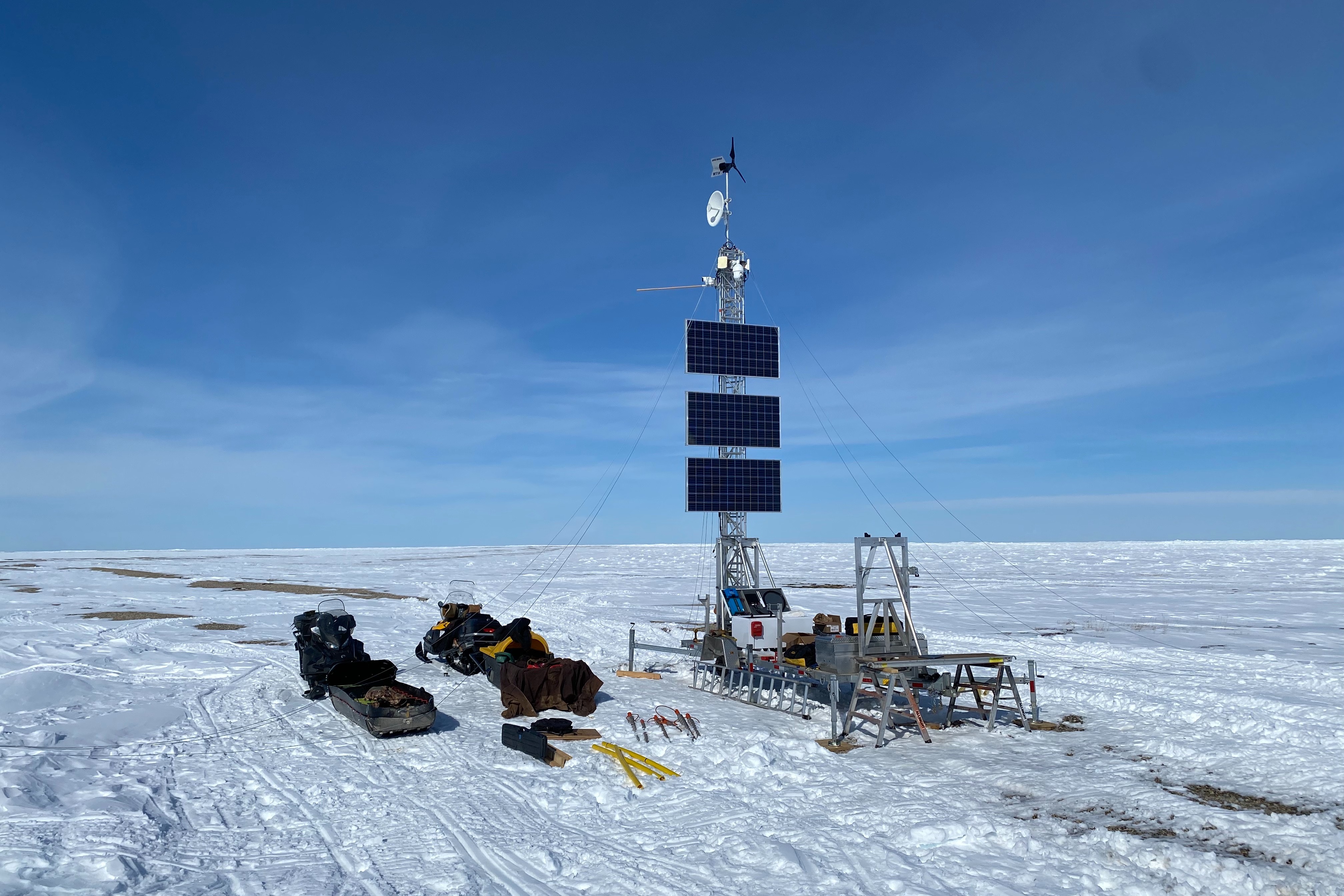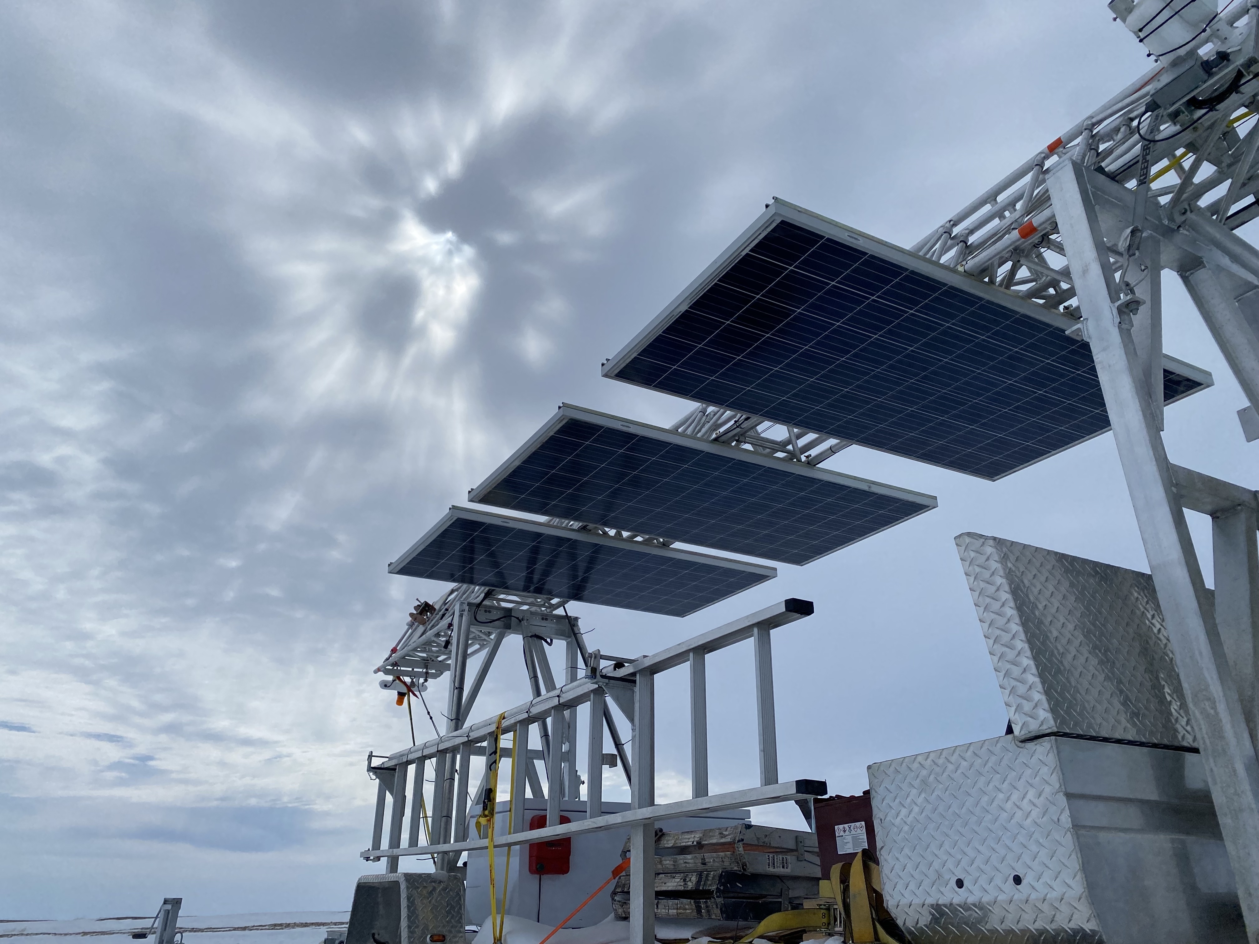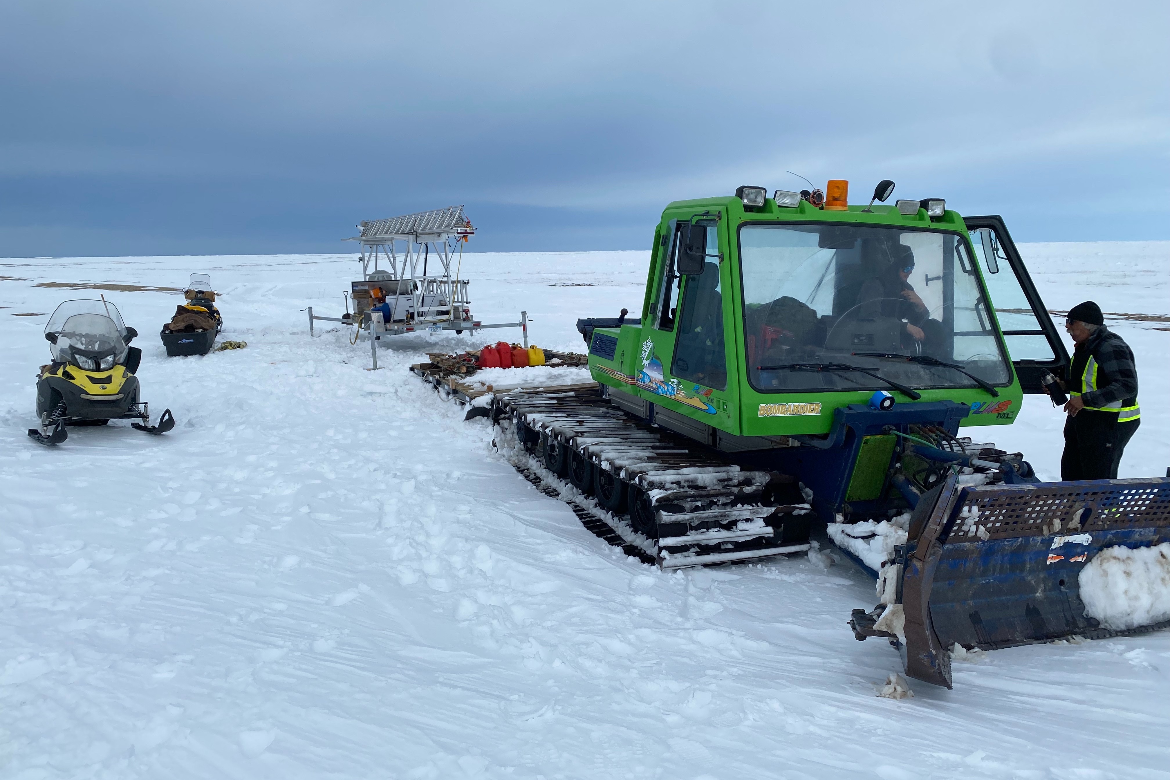 The journey from the town of Churchill to Cape Churchill spans approximately 65 kilometers or 40 miles, with less than half of this distance covered by road. While the road portion of the trip posed little challenge, the remainder of the journey required some creativity and planning. With the tower weighing approximately 1,430 pounds, and an additional 920 pounds of batteries, no ordinary snow machine could safely transport such a heavy load safely. Fortunately, we enlisted the expertise of a local equipped with a BR400 Groomer, more commonly known as a Snowcat, as well as a purpose-built sled made from steel and lumber that was large enough and strong enough to support the trailer. You may have seen a track machine like this one on the side of a ski hill grooming trails, but in this case, their formidable towing capacity made it the ideal choice for our task.
