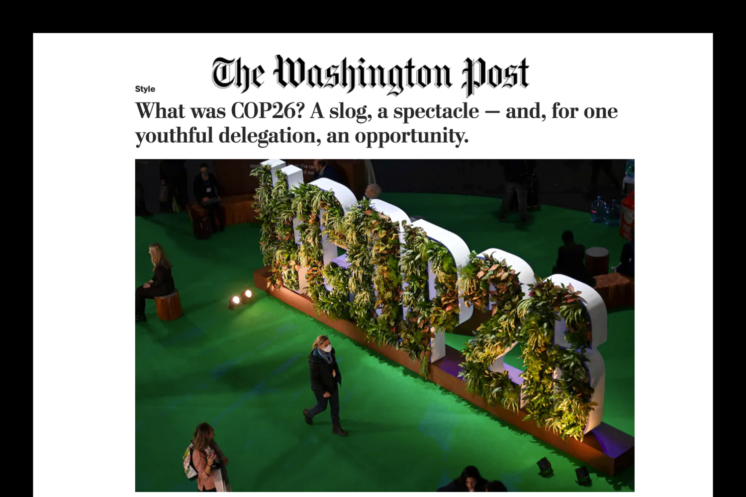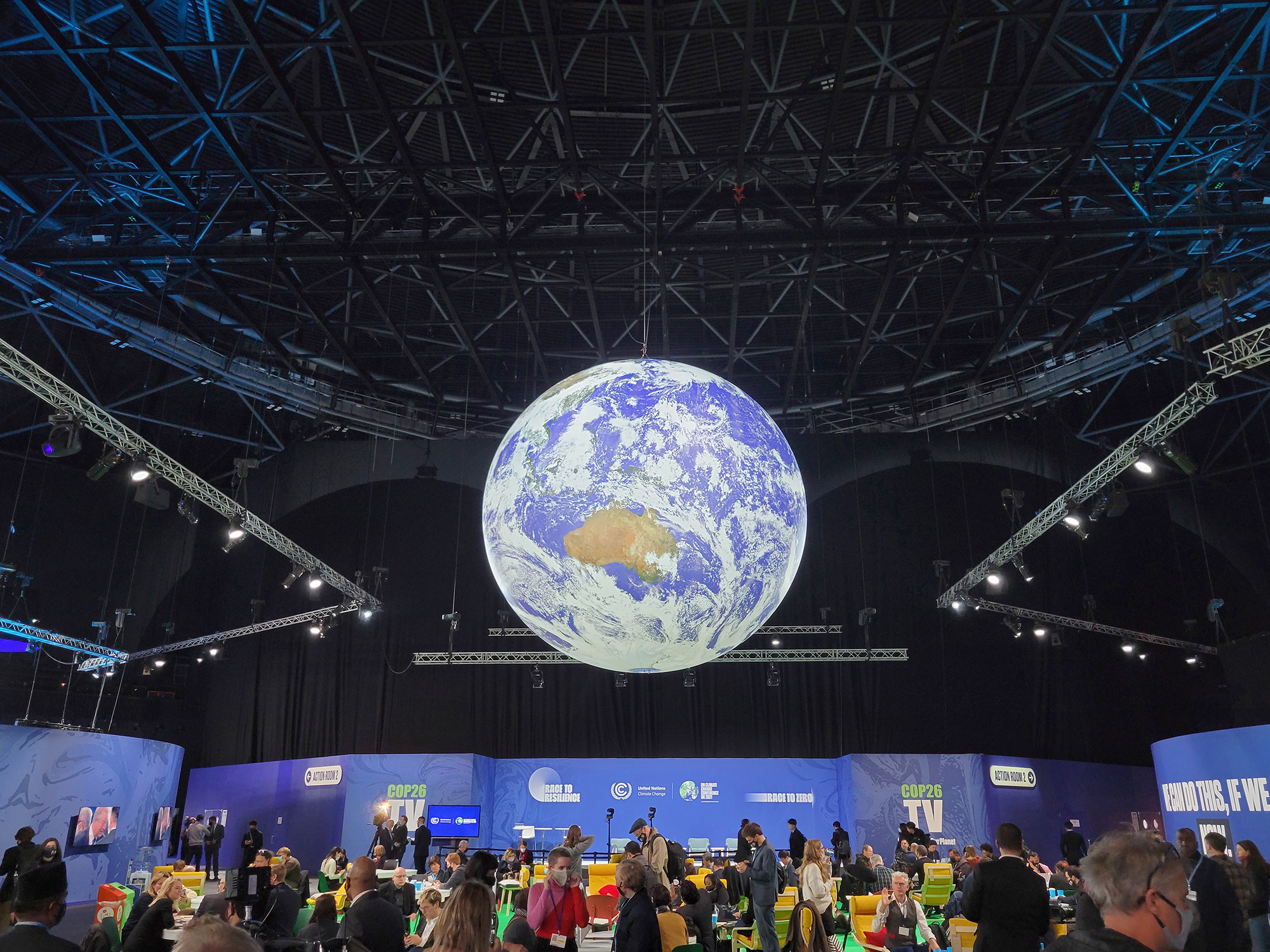 Winding security lines; daily COVID testing; eyes smiling above masks; wishes for our future chalked on sidewalks; news cameras and spotlights; 100,000 people marching in the rain; synthetic blue carpets; business suits; speed walking; a mother and two daughters; voices elevated; voices absent; voices silenced; young leaders coordinating across borders; indigenous leaders calling for justice; weary looks exchanged; people caring for people; a giant illuminated globe spinning dizzily overhead.