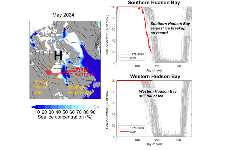 This year’s weather configuration led to strong winds blowing from east to west right across Hudson Bay. At this time of year, the sea ice in Hudson Bay starts to thin as the melt season begins. The winds were strong enough to push the thinning ice towards the west, opening up Eastern and Southern Hudson Bay very early this year (top right panel in Figure 1). This caused ice to pile up in Western Hudson Bay, which remained completely full of ice through June (bottom right panel in Figure 1). The opposing behavior of sea ice in these two ecoregions is, in fact, the most lopsided ever recorded since reliable satellite measurements began in 1979. Never has Southern Hudson Bay been so low on sea ice this early in the year and never has Western Hudson Bay been so full of ice at the same time!