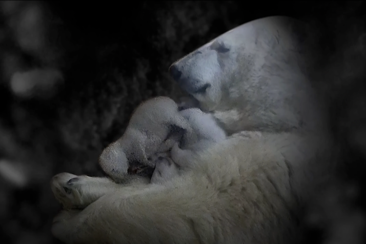 Wild polar bear cubs are most often born in December. The mother gives birth to 1-3 cubs, with twins most common. The family remains in the den until spring. While in the den, the mother bear doesn’t eat or drink. She is devoted to nursing and caring for her cubs.