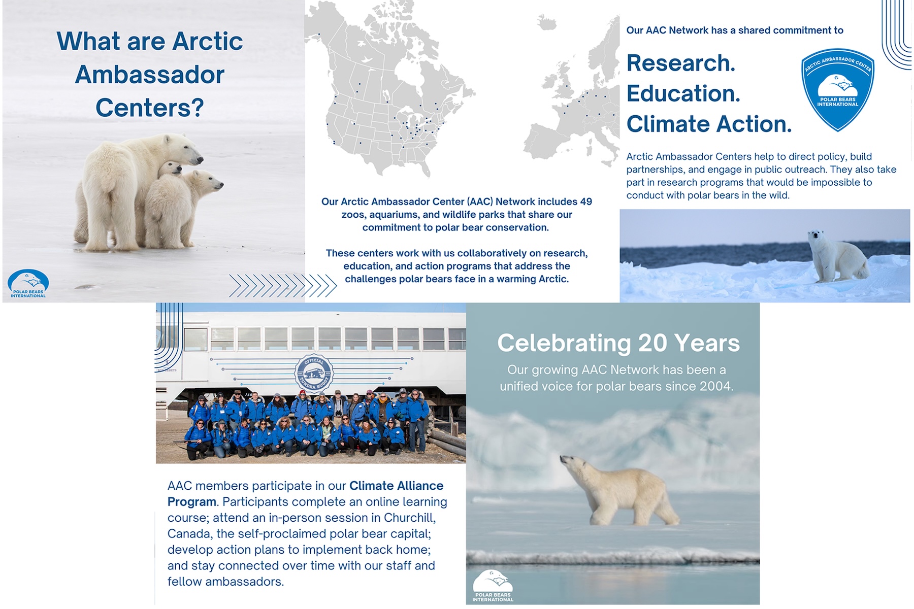 PBI’s Arctic Ambassador Center Network includes 49 zoos, aquariums, and wildlife parks that share our commitment to polar bear conservation. Network members participate in research, education, and action programs that address the key challenges polar bears face in a warming Arctic.